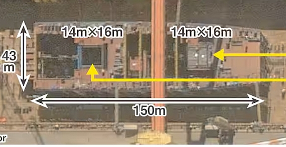 (上與下)2025年11月10日的大連造船廠衛星圖像,推測為004核動力航母總 段長150m、寬43m,其中有兩個14x16m的方形框架,與尺寸佈局與美國核動力 航母的反應器圍組圍組體的方框非常類似。
