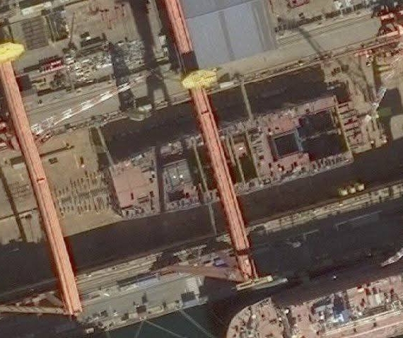 中間有一個方格,與美國航空母艦的反應器艙間非常類似;而畫面右側船塢末端龍門吊車下方的方塊物,