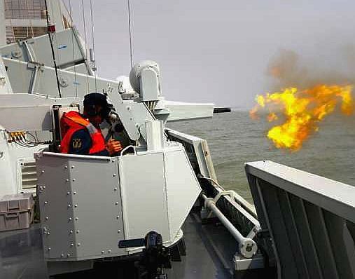 056首艦蚌阜號(582)在2013年4月進行服役後首次實彈射擊訓練的畫面, 上為76mm快砲開火,下為30mm機砲開火。