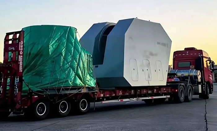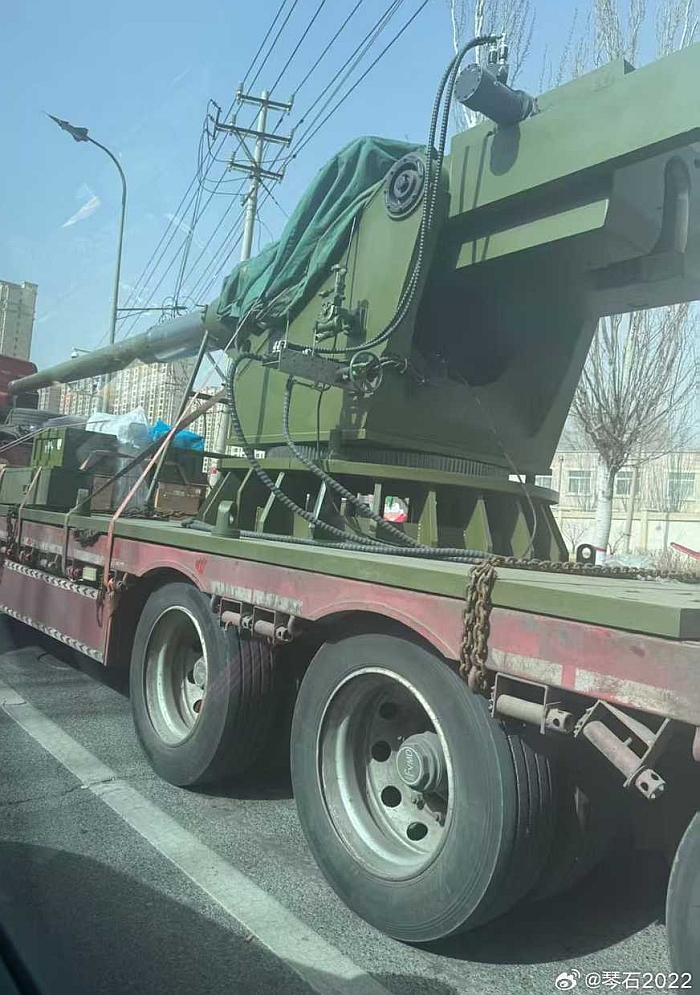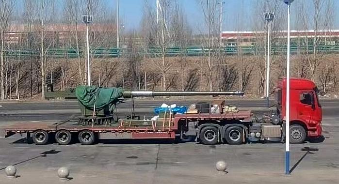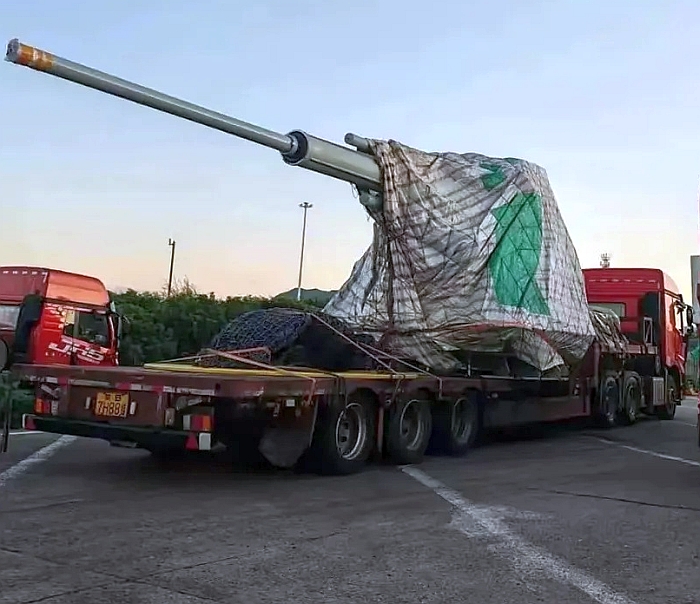 (上與下)2025年3月起,網路上出現中國發展155mm艦砲的跡象;這是載重車運送此種大型艦砲的砲身、
