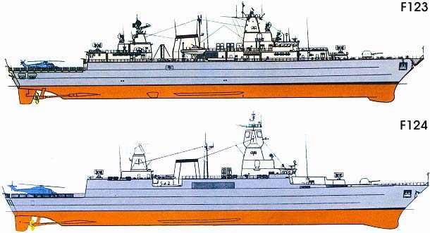 由上而下分別為F-123與F-124。F-123原始設計就留下餘裕來容納NFR-90裝備, 因此德國替代NFR-90的F-124就以F-123的艦體進一步擴充發展。