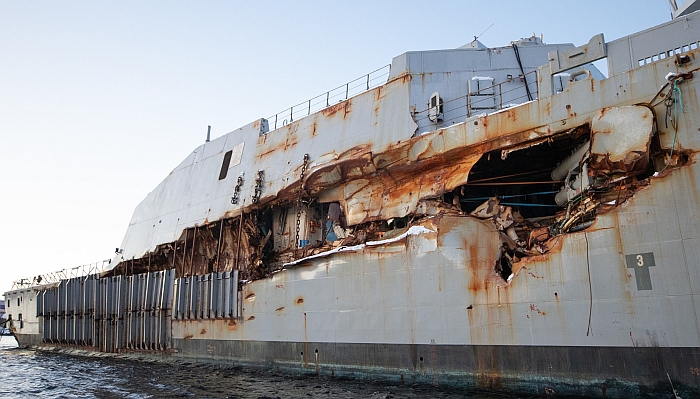 (上與下二張)已經抵達哈肯斯沃恩海軍基地碼頭的海爾格.英斯塔號,挪威軍方盡力拆除、回收艦上