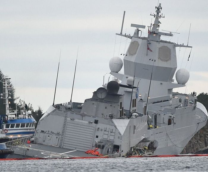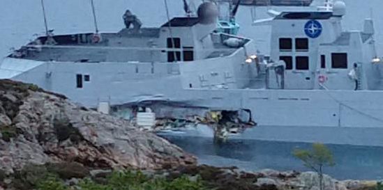在2018年11月8日凌晨海爾格.英斯塔號在卑爾根市港口附近遭到馬耳他籍的索拉號天然氣油船 撞擊,右舷後部嚴重受損。這是在天亮之前艦上官兵正在撤離的畫面,附近有多艘救援船隻。