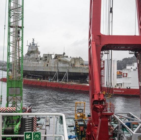 起重駁船與海爾格.英斯塔號巡防艦相互連接並鎖定,成為一個整體單元,由拖船拖到漢諾唐恩水域。