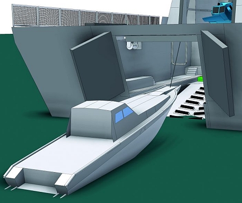 「彈性艦尾」艙,收容艦載小艇的模式。 2.收容集裝箱式任務籌載:在艦尾艙區並排設置兩個儲物架,可平行安裝兩個長度20英尺的ISO集裝箱。這可以用來裝置拖曳陣列聲納(TASS)的集裝箱模組,或無人水下載具(UUV)以及相關的收放/儲存裝置,或者其他收容在集裝箱的任務模組