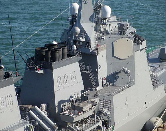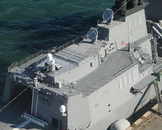 愛宕級二號艦足柄號(DDG-178)的艦首船艛。與美國柏克Flight 2A相同,愛宕級也將朝後的 兩具SPY-1D相位陣列雷達天線提高,以避開機庫結構。
