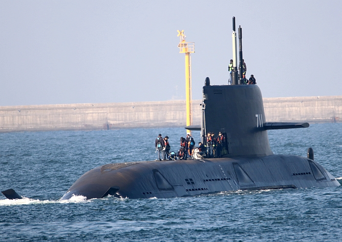 正駛向高雄港出海口的海鯤艦。攝於2026年3月12日上午8時第六次潛航測試出海。