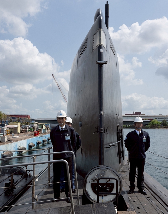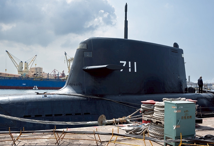 IDS潛艦首艦海鯤號在試航期間停靠台船高雄港91碼頭。攝於2026年3月20日。