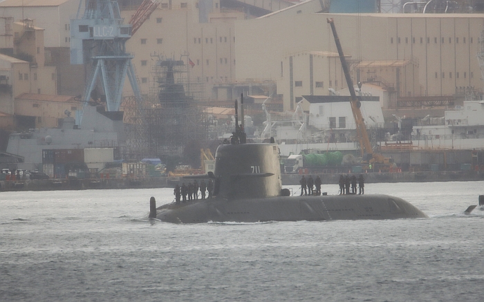 2026年2月6日上午9時,海鯤艦通過高雄港內航道航向出海口。背景可以看到1月2日進入台船並
