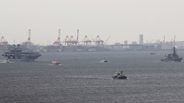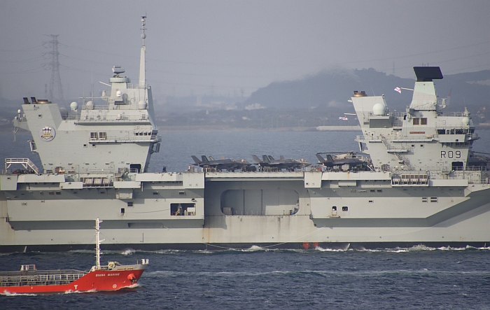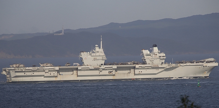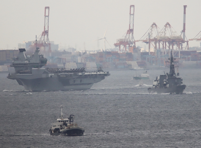 (上與下)威爾斯親王號(HMS Prince of Wales R09)從東京出發,前方視同時間從橫須賀出發的日本海自