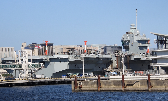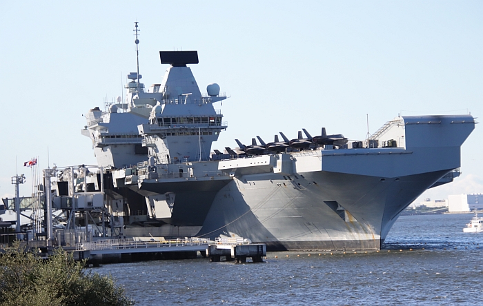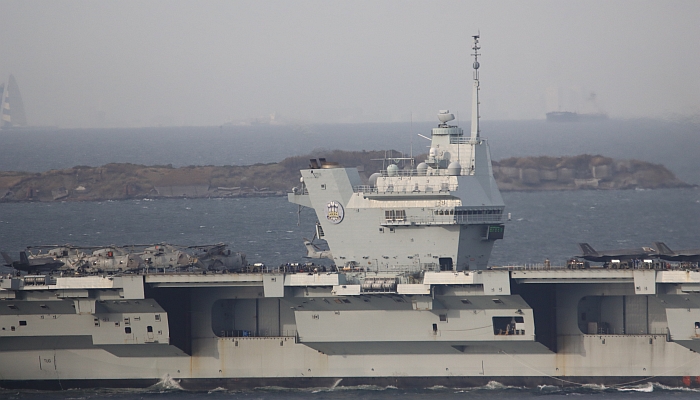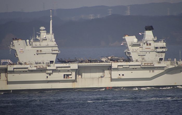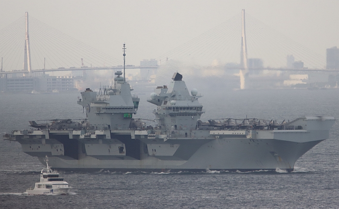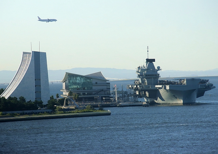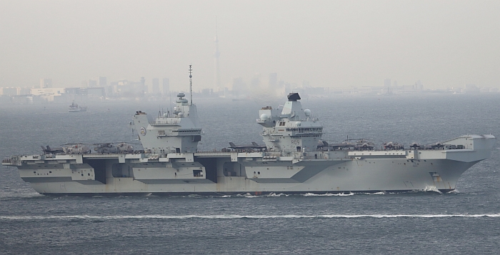結束日本訪問的威爾斯親王號(HMS Prince of Wales R09)從東京出發,注意背景是東京晴空塔。