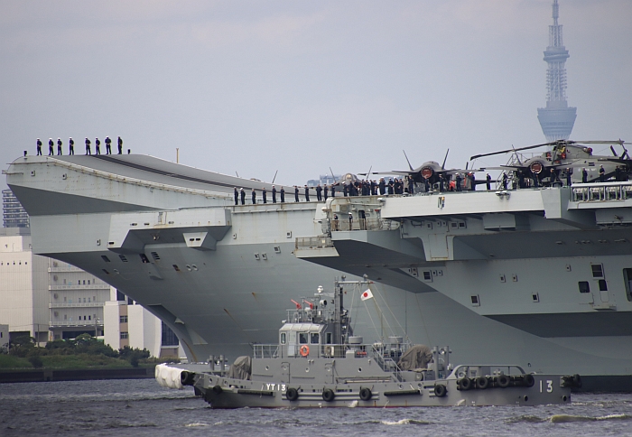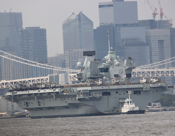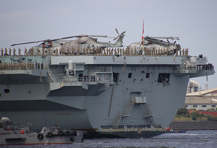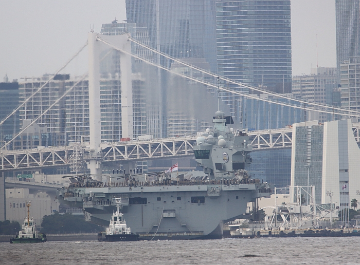 (上與下二張)2025年8月28日,威爾斯親王號(HMS Prince of Wales R09)駛入東京灣。攝於東京城南島。