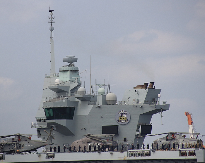 威爾斯親王號後艦島,甲板上有多架梅林直昇機。攝於2025年8月28日東京城南島。