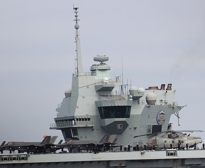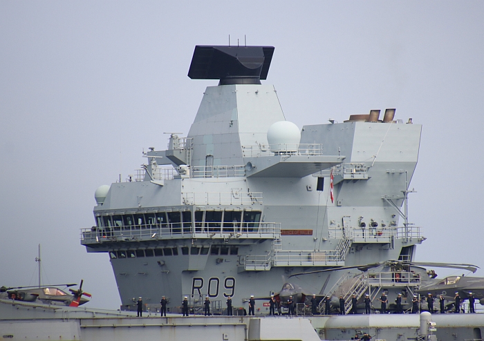 (上與下)威爾斯親王號(HMS Prince of Wales R09)的前部艦島。攝於2025年8月29日東京城南島。