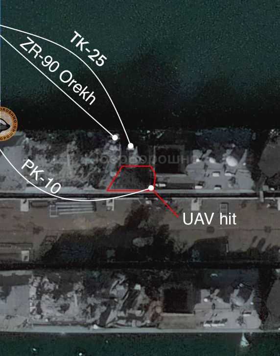 2026年3月4日新西斯克羅基地裡埃森上將號(Admiral Essen)巡防艦的衛星照, 中部上層建築因為UAV攻擊而受損,該處的電子戰與火控設備咸信遭受破壞。 在2026年3月5日,烏克蘭國家安全局(SBU)宣佈,SBU與烏克蘭國防軍武力在3月1日至2日成功襲擊黑海艦隊停靠在新西斯克羅(Novorossiysk) 的埃森上將號(Admiral Essen)巡防艦。SBU透露,烏克蘭以無人飛行載具(UAV)擊中埃森上將號的中部上層船樓,摧毀該艦的作戰、防衛與電子系統,火勢在艦上延燒18小時,造成廣泛破壞。根據3月4日衛星照片,被襲擊後的埃森上將號中部上層出現燒痕,在該處被摧毀的設備可能包括TK-25電子戰系統、PK-10誘餌發射器、MR-90火控雷達,而Fregat-M2M對空監視雷達可能也被波及。埃森上將號是黑海艦隊可以發射口徑(Kalibr)巡航飛彈攻擊烏克蘭的平台之一;SBU宣稱,此次攻擊對埃森上將號造成嚴重破壞,無法再對烏克蘭領土發動攻擊。