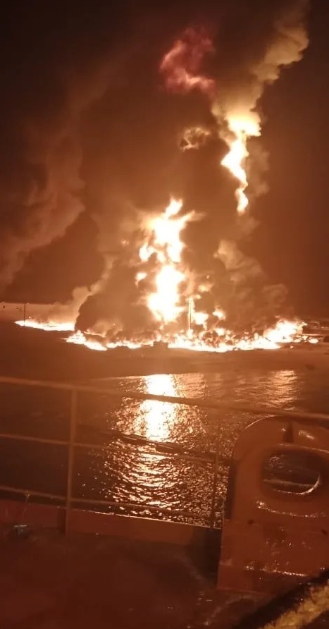 一艘通過葉門Ras Isa港的船隻拍攝到2025年4月17日美軍空襲的照片。