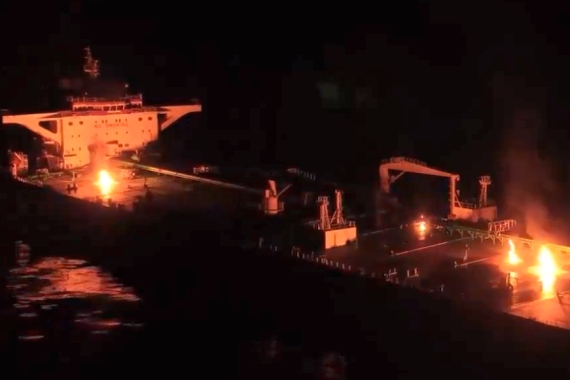 8月29日,胡賽公布第二支爆破Sounion號油輪的影片;此畫面攝於8月22日夜間, 胡賽人員對該輪進行第一次爆破之後燃燒的情況。