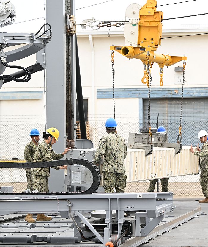 此一起重機以剛性夾具來完全固定飛彈容器,裝入MK-41的發射井時,不受船艦在海上搖晃運動影響,