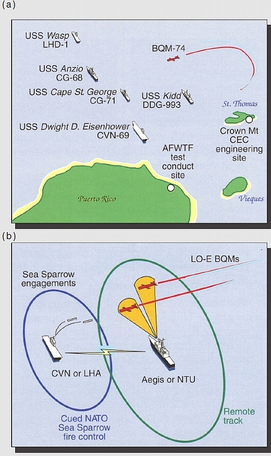 1994年6月CEC在艾森豪號航母打擊群測試的兩個情境 隨後在6月,艾森豪號的航母編隊在靠近波多黎各的大西洋艦隊武器測試中心(Atlantic Fleet Weapons Test Facility,AFWTF)進行了CEC的第一次實際接戰測試項目。在這項測試中,BQM-74E靶機從波多黎各升空向東飛行,然後向西迴轉,朝向這支航母編隊所在的海域以及低高度飛行飛行,模擬水平線外飛來的掠海反艦飛彈。此項測試包含兩個情境: