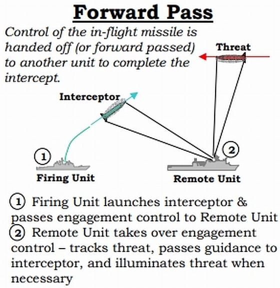 某節點透過CEC從遠端(其他節點)取得目標接觸與追蹤資料,由節點本身下達接戰決定、發射飛彈並自行負責飛彈飛行途中的接戰控制,但飛彈飛行途中所需的通信中繼以及終端照射也都是藉由遠方平台協助完成,如此本地節點就能在遠端節點協助下,接戰一個在水平線以外的目標。 4.前沿傳遞(FP):