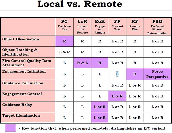 堪稱最單純的接戰情境,是由遠端節點獲得目標搜索、精確追蹤識別資料,後續的接戰起始、控制、解算、發射與射控導引都由本地平台完成,這種情境相當於只配備短程自衛防空系統的船艦(航空母艦、兩棲艦等),透過CEC網路提前獲得目標方位與精確追蹤等提示,提前進行接戰作業,將本艦防空自衛系統的效能最大化。 2.由遠端發射(LoR):