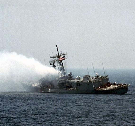 中了伊朗佈放的水雷,嚴重受損,但靠著艦上人員出色的損管而存活。此為該艦控制住災情後