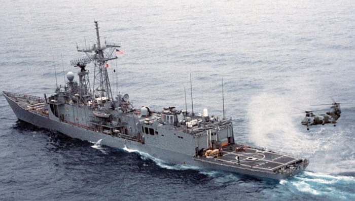 2000年代拍攝的派里級艾羅德號(USS Elrod FFG-55)。注意艦首原MK-13位置加裝了一挺MK-38 Mod2