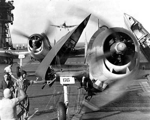 在企業號甲板上發動引擎的F-6F,後方正有一架飛機準備著陸。此照片攝於空襲特魯克。