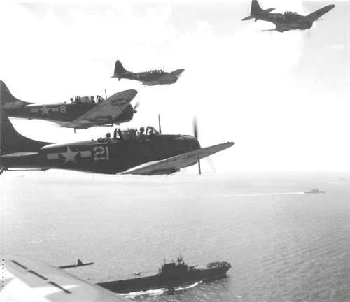 一隊SBD俯衝轟炸機正飛過企業號的上空。