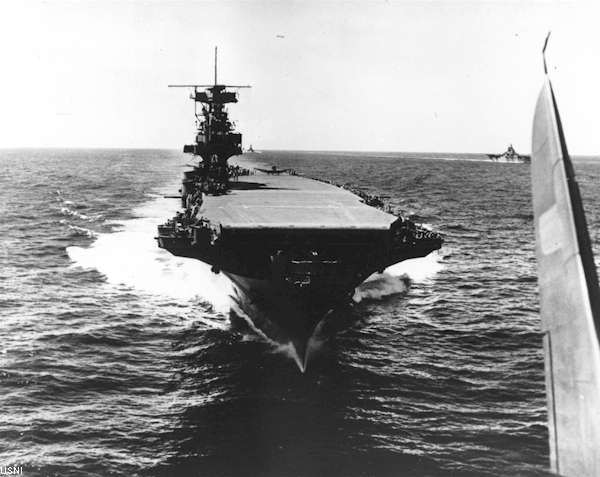 在太平洋上與友艦結伴而行的企業號(中間),甲板有一架SBD正準備起飛。右上方為一艘美軍愛賽克斯級航艦。